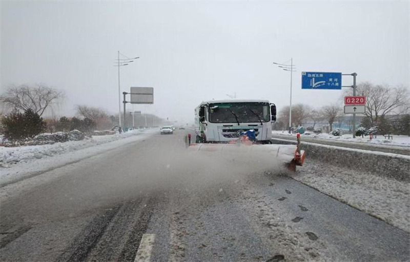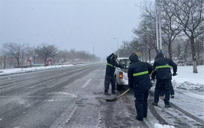 降雪后,按照“雪隨下隨清”的原則,待命隊(duì)員迅速行動(dòng),在包保路段通過滾刷鏟雪、撒布融雪劑、人工清掃等方式循環(huán)作業(yè),高效開展除雪工作。